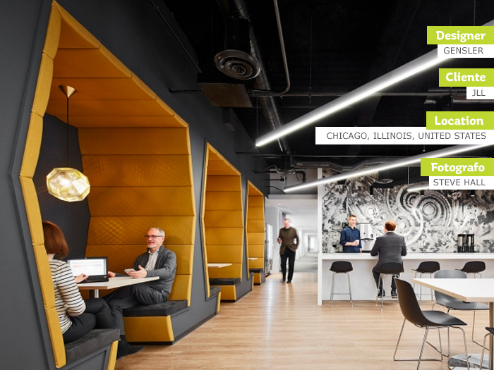 La società di servizi immobiliare JLL ha voluto ammodernare i suoi uffici di Chicago, in uno stabile di sei piani che ospita 1200 dipendenti. Il risultato della ristrutturazione è uno spazio incentrato sulla persona, in un ambiente flessibile. Le nuove workstation di JLL, chiamate Studios, sono progettate pensando alla flessibilità e alla collaborazione. Sono dotati di scrivanie ad altezza regolabile con pannelli fonoassorbenti per la privacy che si muovono su e giù con il desktop. E ogni scrivania è dotata di un monitor che si alza e si abbassa, senza più curvarsi sui laptop. Tutti i principali mobili sono su ruote in modo che i dipendenti possano modellare il proprio spazio anziché esserne confinati.