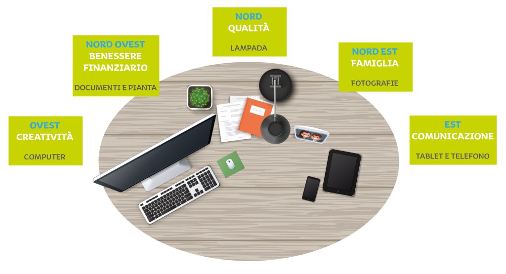 L’area a destra è quella della comunicazione. Lì andrebbe messo quindi il cellulare, oppure il telefono o il tablet, insomma lo strumento che ti permette di entrare in contatto con il mondo esterno.