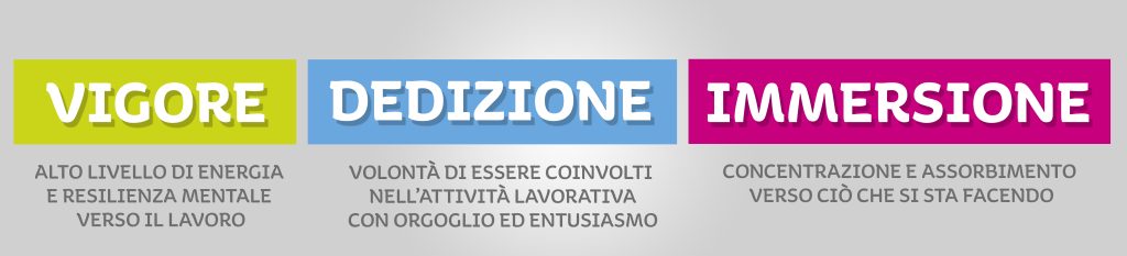 I tre aspetti chiave (vigore, dedizione e immersione) vengono misurati dalla Ultrecht Work Engagement Scale (UWES) che è disponibile in venti lingue e in versione anche semplificata dedicata agli studenti; il vigore è l’alto livello di energia e resilienza mentale verso il lavoro, la volontà di investire sforzi nel lavoro e la persistenza quando si incontrano difficoltà; la dedizione è la volontà di essere coinvolti nell’attività lavorativa, con orgoglio ed entusiasmo; l’immersione, infine, è la concentrazione e l’assorbimento verso ciò che si sta facendo durante l’attività lavorativa.