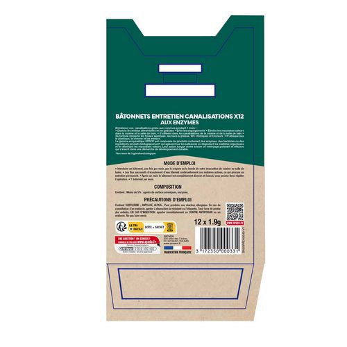 Bastoncini per la manutenzione delle tubature progettati per evitare i tappi e neutralizzare in modo permanente gli odori cattivi. Formula naturale a base di enzimi e spore di batteri per un'azione efficace ed ecologica. Rilascio continuo di agenti attivi a contatto con l'acqua per una manutenzione a lungo termine. Uso sicuro, senza acidi e soda, compatibile con tutti i serbatoi settici. Pratico formato di 12 bastoncini adatto a tutti i tipi di tubature: lavello, doccia, lavandino, vasca.
