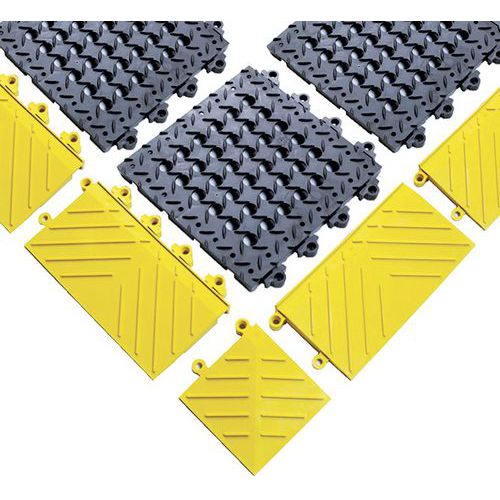 - Rampa di sicurezza in nitrile compatibile con modulo antifatica e-Flex™ Notrax. Disponibile in nero e giallo, il collegamento di questo bordo è possibile su ogni lato del modulo. Cornice dei moduli per una finitura perfetta. Facile da installare mediante sistema di ganci di collegamento. L'angolo a 10° consente il facile passaggio delle sedie a rotelle sulla rampa riducendo al minimo il rischio di ribaltamento.