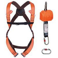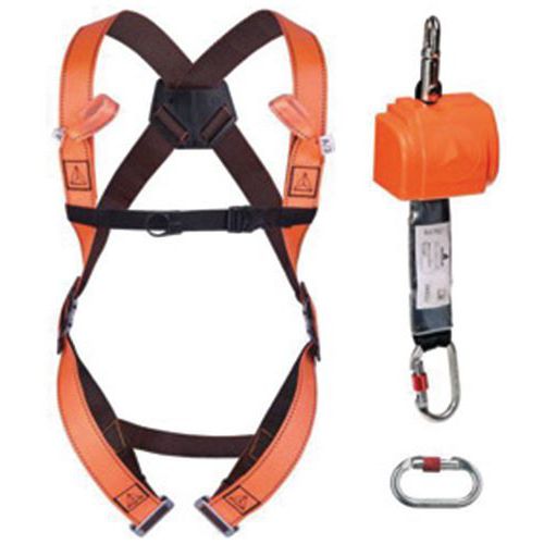 - -Imbracatura due punti di ancoraggio-Arrotolatore anti caduta con cavo in acciaio-Cordino singolo con moschettone e gancio da ponteggio-Moschettone-Borsa a tracolla in Nylon