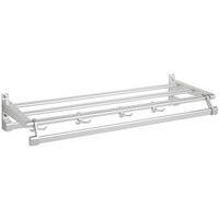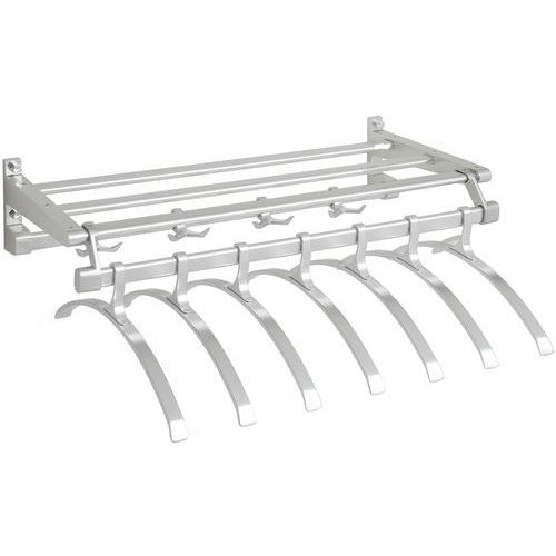 Appendiabiti da parete in alluminio anodizzato di ottima finitura con appendini. Materiali della struttura, delle aste e degli appendini resistenti e durevoli. Ripiano con doghe sul livello superiore per riporre oggetti. 1 asta posteriore con appendini, 1 asta anteriore porta grucce.