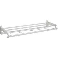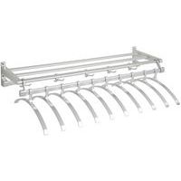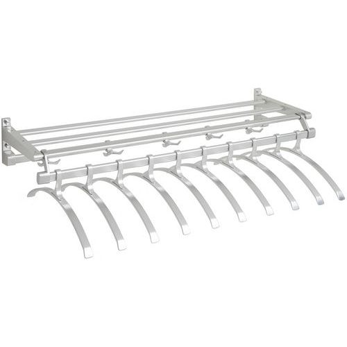 Appendiabiti da parete in alluminio anodizzato di ottima finitura con appendini. Materiali della struttura, delle aste e degli appendini resistenti e durevoli. Ripiano con doghe sul livello superiore per riporre oggetti. 1 asta posteriore con appendini, 1 asta anteriore porta grucce.