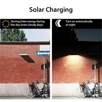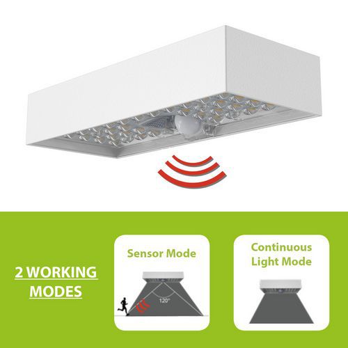 Applique solare a led in policarbonato anti-UV e ABS, design contemporaneo ed estremamente elegante, IP65: resistente agli urti e agli agenti atmosferici, la parte elettronica è particolarmente resistente all'acqua. Funzionamento: la lampada si ricarica durante la giornata, grazie ai raggi del sole. 2 modalità d'uso: 1) Il lampione si illumina automaticamente la notte e mantiene una luminosità del 50% per 5 ore. Successivamente (o quando la carica della batteria è inferiore al 30%), il lampione passa in modalità risparmio energetico: il lampione si illumina automaticamente al 100% della luminosità fino a quando non viene rilevato un movimento a una distanza ≤6 m, quindi si spegne dopo 20 secondi di assenza di movimento. 2) Modalità sensore di movimento: la lampada si illumina automaticamente al 100% della luminosità quando viene rilevato un movimento a una distanza di ≤ 6 m, quindi diminuisce al 5% una volta trascorsi 20 secondi senza aver rilevato alcun movimento. La lampada è dotata