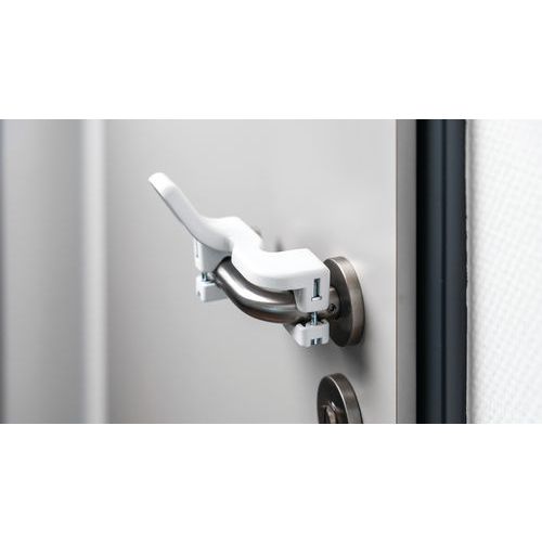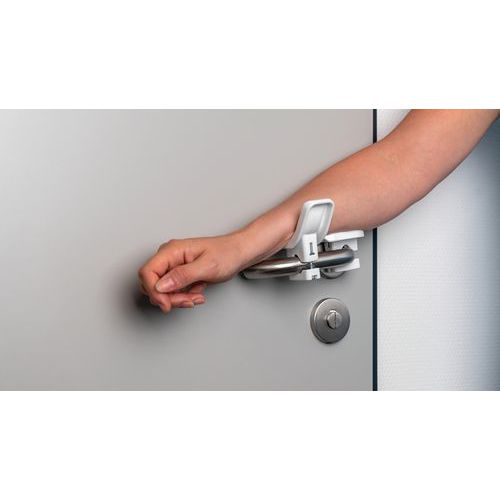 Importante: non installare su porta tagliafuoco (norme DIN 18273 e EN 1634) e uscite di emergenza (norme EN 179 e EN 16034). Materiale ABS ignifugo conforme agli edifici pubblici (secondo la norma DIN 4102-1), resistente ai prodotti per pulizia e di disinfezione, nessun rischio di deterioramento. Da fissare sulle maniglie, senza rischio di danneggiarle.