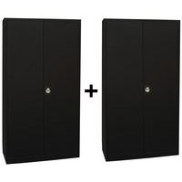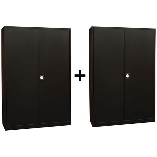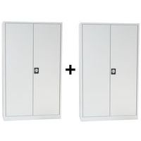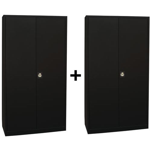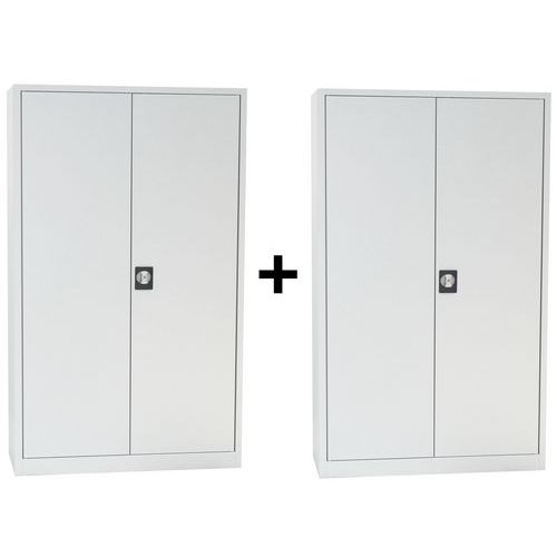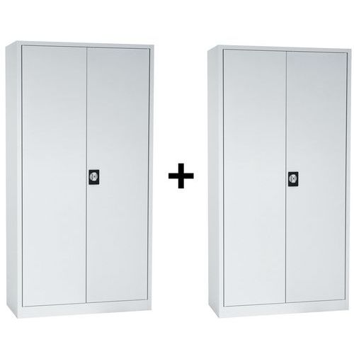 Armadio con ante a battente e parete estremamente solida. Ripiano regolabile con una portata massima di circa 60 kg. L'armadio è dotato di una serratura a cilindro a due punti. Spessore della lamiera dei 2 armadi 0,7 mm.