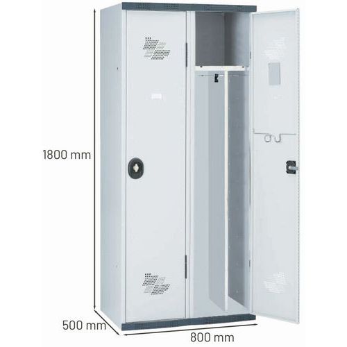 Armadietto in lamiera d'acciaio di prima scelta, molto robusto e indeformabile. Lamiera d'acciaio 6/10 profilata (equivale a piegatura standard 8/10). Colonne saldate tra di loro per maggiore robustezza. Appendiabiti doppio separato per indumenti puliti e sporchi. Eccellente resistenza meccanica con profilo chiuso aggraffato. Anta impossibile da scardinare aperta o chiusa, antieffrazione. Articolazione su cerniere con apertura a 180°. Armadietto con porta-etichette integrato.
