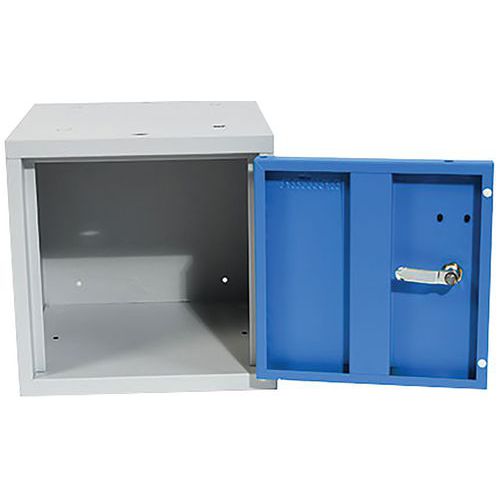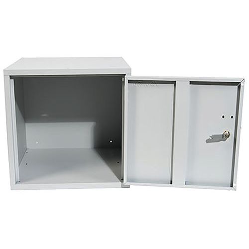 Armadietto a cubo a scomparti preforato da assemblare. Chiusura a chiave tramite serratura a cilindro. Scomparto con alloggio per porta-etichette. Confortevole con apertura dell’anta a 180°.