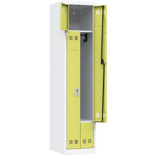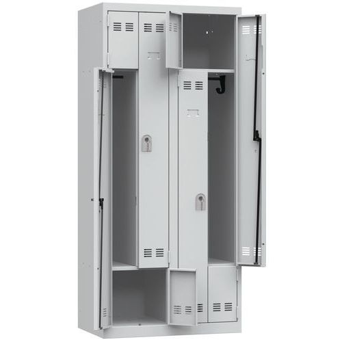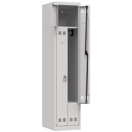 Armadietto a L a ingombro ridotto da 1 a 3 colonne. Consente a ogni utente di beneficiare di uno scomparto e di un appendiabiti. Lo spazio di sistemazione è utilizzabile al massimo della capacità. Consigli di sicurezza: - Installare il mobile su una superficie piana - Fissarlo a un muro o a una parete divisoria con dispositivi di fissaggio appropriati - Prestare attenzione a non superare il carico massimo consigliato e a ripartirlo adeguatamente