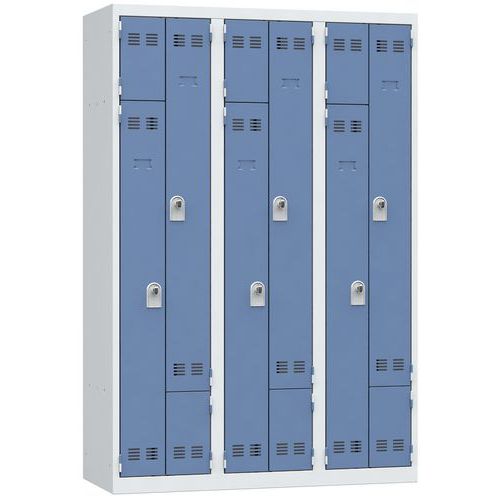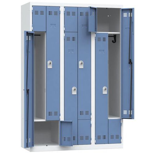 Armadietto a L a ingombro ridotto da 1 a 3 colonne. Consente a ogni utente di beneficiare di uno scomparto e di un appendiabiti. Lo spazio di sistemazione è utilizzabile al massimo della capacità. Consigli di sicurezza: - Installare il mobile su una superficie piana - Fissarlo a un muro o a una parete divisoria con dispositivi di fissaggio appropriati - Prestare attenzione a non superare il carico massimo consigliato e a ripartirlo adeguatamente