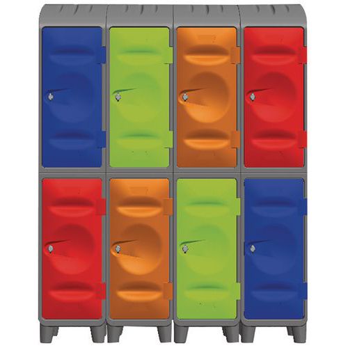 Attenzione: armadietto fornito senza attrezzatura interna e lucchetto (ansa lucchetto ⌀ mini 5 mm, maxi 7,5 mm): accessori come ripiano con o senza portagrucce, lucchetto e copertura da ordinare separatamente. Consigli di sicurezza: installate il mobile su una superficie piana, fissatelo al muro o a una parete divisoria con dispositivi di fissaggio appropriati, rispettate il carico massimo consigliato e distribuitelo in modo uniforme. Consiglio: sovrapponete 2 armadietti per realizzare una configurazione più alta e variate i colori!