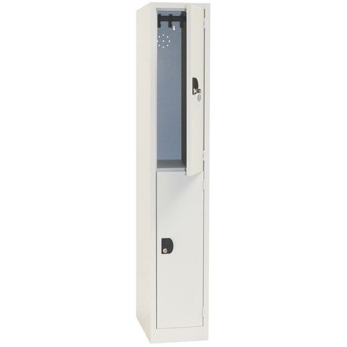Armadio multiscomparto appendiabiti in finitura elegante epossidica. Angoli arrotondati per la massima sicurezza. Armadietto con rivestimento ultra resistente ai graffi. Chiusura silenziosa con finecorsa in plastica. Feritoia di aerazione sul fondo di ciascun scomparto. Maniglia di chiusura con porta-etichette.