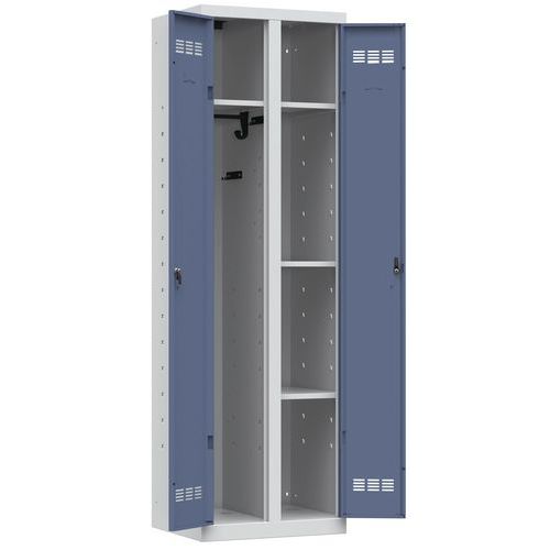 Armadietto multiuso a 2 ante. Composto da una parte appendiabiti e una parte di sistemazione. Gamma moderna che combina qualità, sicurezza e design. Saldato in fabbrica per garantire la massima robustezza. Livello di resistenza all'effrazione molto elevato. Consigli di sicurezza: - Installare il mobile su una superficie piana - Fissarlo a un muro o a una parete divisoria con dispositivi di fissaggio appropriati - Prestare attenzione a non superare il carico massimo consigliato e a ripartirlo adeguatamente