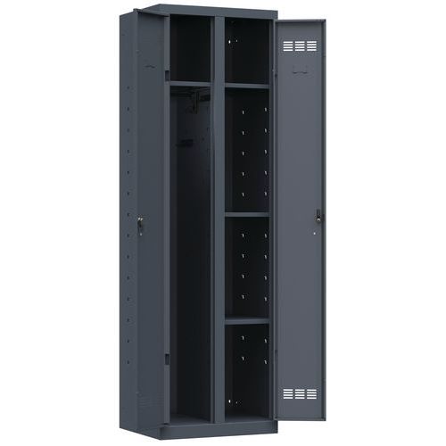 Armadietto multiuso a 2 ante. Composto da una parte appendiabiti e una parte di sistemazione. Gamma moderna che combina qualità, sicurezza e design. Saldato in fabbrica per garantire la massima robustezza. Livello di resistenza all'effrazione molto elevato. Consigli di sicurezza: - Installare il mobile su una superficie piana - Fissarlo a un muro o a una parete divisoria con dispositivi di fissaggio appropriati - Prestare attenzione a non superare il carico massimo consigliato e a ripartirlo adeguatamente