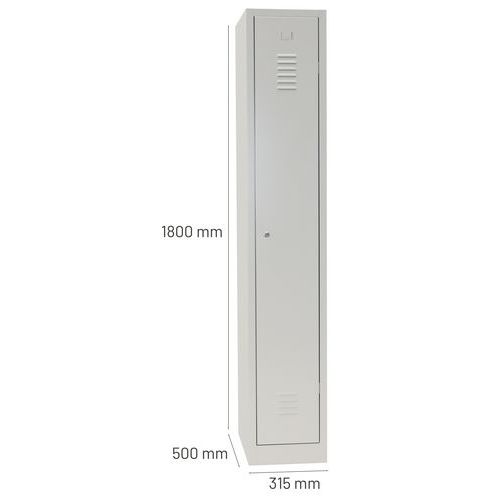 Armadietto in acciaio robusto ad ante rinforzate. Apertura ottimale a 180° e cerniere a scomparsa. Igienico con ventilazione alta e bassa delle ante. Fori per aggancio alla parete, portaetichette integrato.