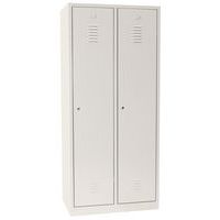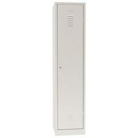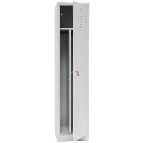 Armadietto da magazzino robusto speciale per abiti sporchi, fornito in imballo piatto, interamente smontato. Struttura in metallo resistente con rivestimento di finitura verniciato a polvere elettrostatica. 1 scomparto alto, 1 appendiabiti inferiore suddiviso in 2 scomparti da una parete. Anta rinforzata con cerniere invisibili, antirumore con smorzatore in plastica. Anta tipo a doppia persiana per la circolazione dell'aria e portaetichette stampato. Pratico armadietto con ampia apertura dell'anta a 115°. Sistema di chiusura non incluso.