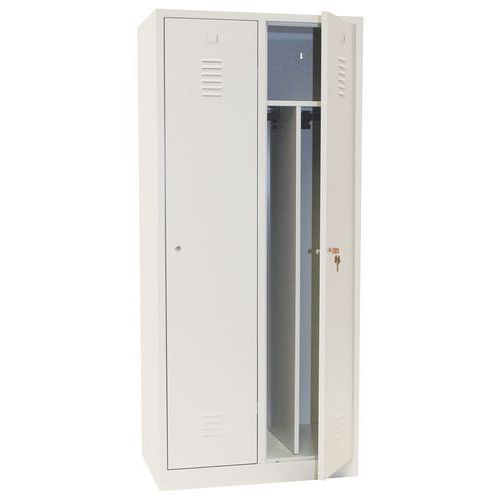 Armadietto su base per indumenti sporchi con ante rinforzate. Apertura ottimale a 180° con cerniere a scomparsa. Appendiabiti con separazione indumenti puliti/sporchi. Fori per aggancio alla parete, portaetichette integrato. Armadietto igienico con aerazione delle ante in alto e in basso.