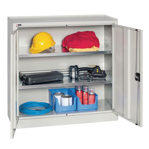 - Dotato di due ripiani regolabili in acciaio zincato.
