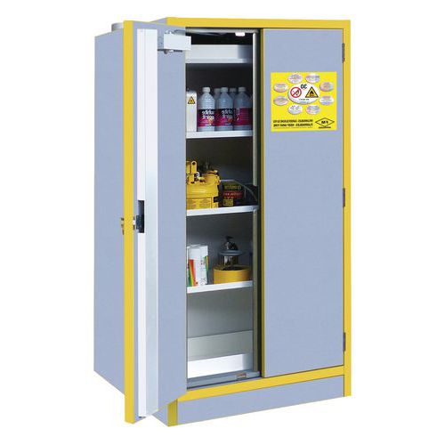 L'armadio a 1 anta è fornito con 3 ripiani di ritenzione in acciaio e 1 vasca di ritenzione in acciaio. Gli armadi a 2 ante sono forniti con 2 ripiani di ritenzione in acciaio e 1 vasca di ritenzione in acciaio. Pittogrammi standard a norma ISO 3864, EN 14470-1 (04-2004) e secondo la direttiva 92/58/CEE e le specifiche FM.