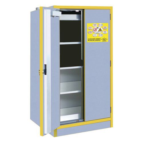 L'armadio a 1 anta è fornito con 3 ripiani di ritenzione in acciaio e 1 vasca di ritenzione in acciaio. Gli armadi a 2 ante sono forniti con 2 ripiani di ritenzione in acciaio e 1 vasca di ritenzione in acciaio. Pittogrammi standard a norma ISO 3864, EN 14470-1 (04-2004) e secondo la direttiva 92/58/CEE e le specifiche FM.