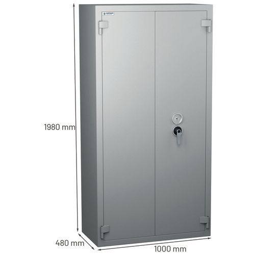 | Descrizione | Armadio blindato ignifugo, Altezza totale: 1980 mm, Larghezza totale: 1000 mm, Tipo di chiusura: Con chiave |