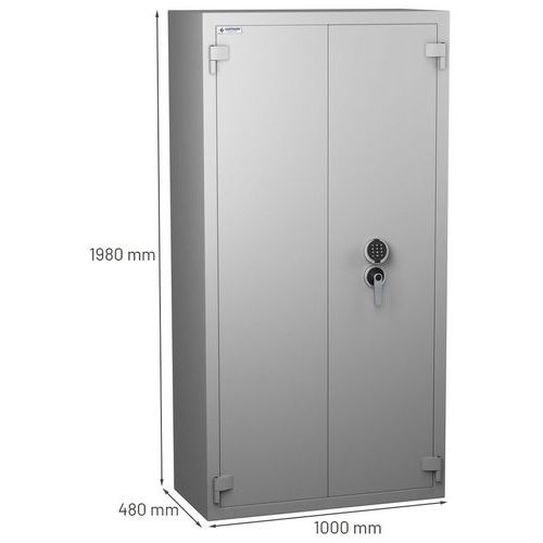 | Descrizione | Armadio blindato ignifugo, Altezza totale: 1980 mm, Larghezza totale: 1000 mm, Tipo di chiusura: Con codice |