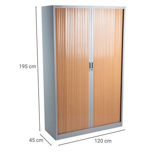 Scoprite la facilità di utilizzo di questo armadio molto largo ma compatto. Regolate i ripiani e utilizzateli anche per le cartelle sospese. Finitura con vernice epossidica antigraffio. Chiudete a chiave le serrande in plastica con una serratura a cilindro. Consigli di sicurezza: - Installare il mobile su una superficie piana - Fissarlo a un muro o a una parete divisoria con dispositivi di fissaggio appropriati - Prestare attenzione a non superare il carico massimo consigliato e a ripartirlo adeguatamente