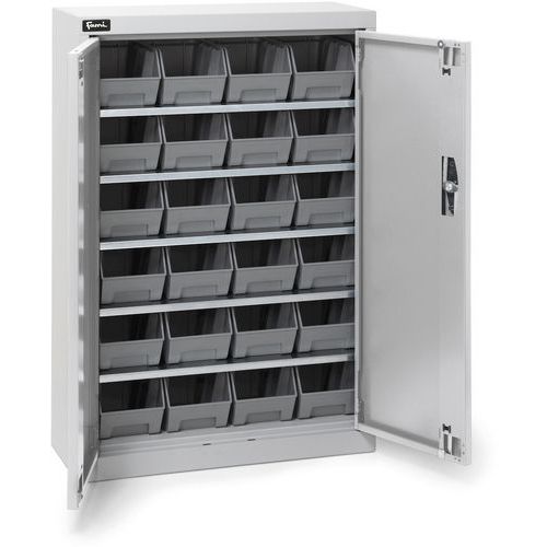 Realizzato in lamiera d'acciaio resistente, l’armadio di stoccaggio ha due ante a battente con serratura a cilindro per garantire l’accesso solo al personale autorizzato.