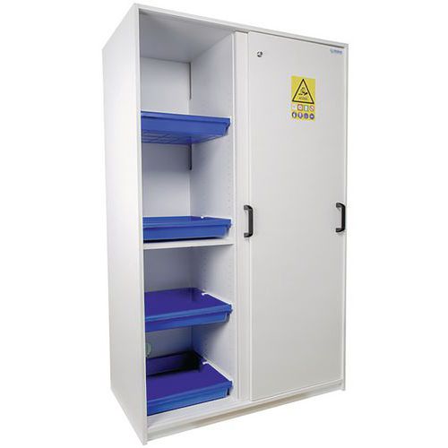 Armadio di sicurezza a scomparti per separare acidi e basi. Dotato di piedi con martinetti per la messa a livello. Vaschette di raccolta in polipropilene su guide scorrevoli. Struttura resistente alle aggressioni dei vapori corrosivi. Fori di ventilazione per il collegamento alla cassa di ventilazione. Conforme alle raccomandazioni INRS.