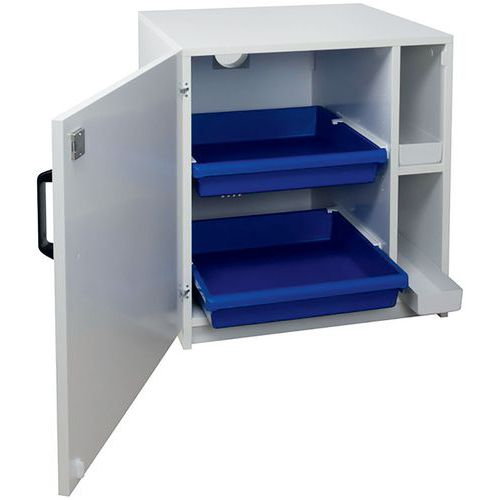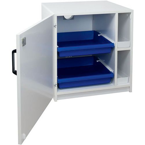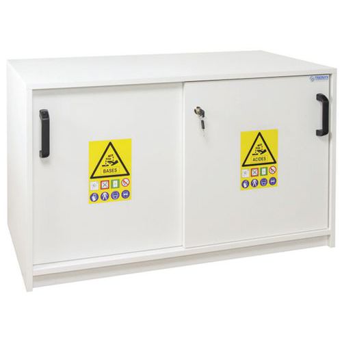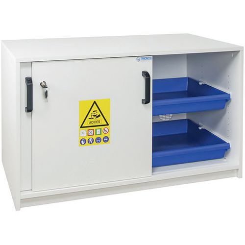 Armadio di sicurezza a scomparti per separare acidi e basi. Dotato di piedi con martinetti per la messa a livello. Vaschette di raccolta in polipropilene su guide scorrevoli. Struttura resistente alle aggressioni dei vapori corrosivi. Fori di ventilazione per il collegamento alla cassa di ventilazione. Conforme alle raccomandazioni INRS.