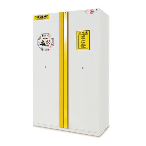 Armadio di sicurezza con chiusura delle ante a chiave. Adatto per la messa a terra con martinetto di livellamento. Ripiani in acciaio a prova d'incendio e regolabili in altezza. Chiusura automatica delle ante quando la temperatura ambiente supera i 50 °C.