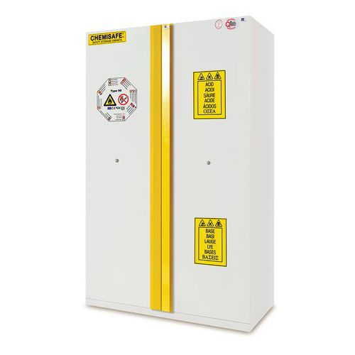Armadio di sicurezza con chiusura delle ante a chiave. Adatto per la messa a terra con martinetto di livellamento. Ripiani in acciaio a prova d'incendio e regolabili in altezza. Chiusura automatica delle ante quando la temperatura ambiente supera i 50 °C.