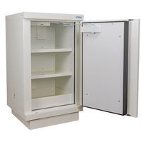 Armadio di sicurezza con chiusura a chiave. Maniglia che copre l'intera altezza dell'anta per una migliore ergonomia e facilità di apertura. Fori di ventilazione per il collegamento alla cassa di ventilazione. Piani di contenimento regolabili in passi da 6,4 cm. Conforme alle norme EN14470-1 e FM 6050. Giunti per porta termodilatanti. Punto di fissaggio per messa a terra. Resistenza al fuoco per 90 minuti e testato fino a 105 minuti.