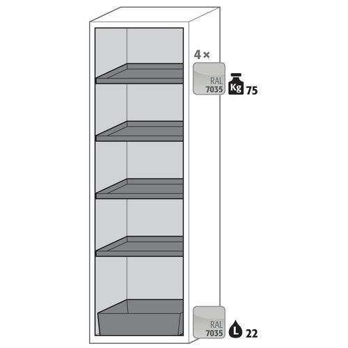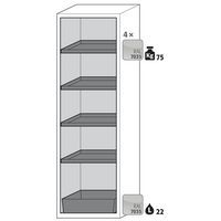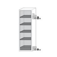 Stoccaggio sicuro, conforme alla normativa in vigore relativamente alle sostanze pericolose e infiammabili nelle aree di lavoro Funzione/costruzione: robusta e duratura: struttura esterna solida in acciaio con rivestimento epossidico, 3 cerniere di fissaggio per porta, meccanismo di chiusura completo ed elementi di sicurezza con protezione contro la corrosione montati fuori dalla zona di stoccaggio Utilizzo controllato: porta con serratura, compatibile con chiusura centralizzata Installazione facile: piedi regolabili integrati Aerazione e ventilazione: sistema di aerazione e ventilazione integrate grazie al collegamento (diametro 75 mm) con un dispositivo di evacuazione dell'aria - Realizzato in Germania Realizzato in Germania