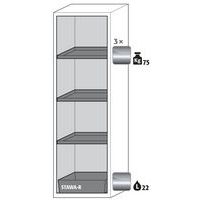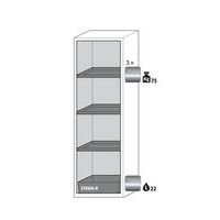 Stoccaggio sicuro, conforme alla normativa in vigore relativamente alle sostanze pericolose e infiammabili nelle aree di lavoro Funzione/costruzione: robusta e duratura: struttura esterna solida in acciaio con rivestimento epossidico, 3 cerniere di fissaggio per porta, meccanismo di chiusura completo ed elementi di sicurezza con protezione contro la corrosione montati fuori dalla zona di stoccaggio Utilizzo controllato: porta con serratura, compatibile con chiusura centralizzata Installazione facile: piedi regolabili integrati Aerazione e ventilazione: sistema di aerazione e ventilazione integrate grazie al collegamento (diametro 75 mm) con un dispositivo di evacuazione dell'aria - Realizzato in Germania Realizzato in Germania