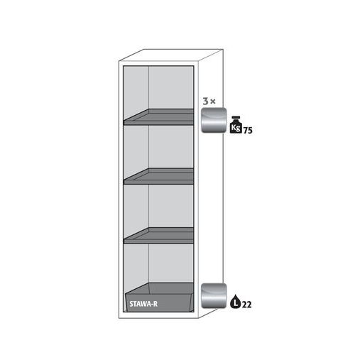 Stoccaggio sicuro, conforme alla normativa in vigore relativamente alle sostanze pericolose e infiammabili nelle aree di lavoro Funzione/costruzione: robusta e duratura: struttura esterna solida in acciaio con rivestimento epossidico, 3 cerniere di fissaggio per porta, meccanismo di chiusura completo ed elementi di sicurezza con protezione contro la corrosione montati fuori dalla zona di stoccaggio Utilizzo controllato: porta con serratura, compatibile con chiusura centralizzata Installazione facile: piedi regolabili integrati Aerazione e ventilazione: sistema di aerazione e ventilazione integrate grazie al collegamento (diametro 75 mm) con un dispositivo di evacuazione dell'aria -
