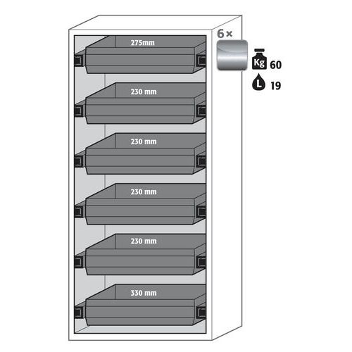 Stoccaggio sicuro, conforme alla normativa in vigore relativamente alle sostanze pericolose e infiammabili nelle aree di lavoro Funzione/costruzione: robusta e duratura: struttura esterna solida in acciaio con rivestimento epossidico, 3 cerniere di fissaggio per porta, meccanismo di chiusura completo ed elementi di sicurezza con protezione contro la corrosione montati fuori dalla zona di stoccaggio Utilizzo controllato: porte con serratura, compatibili con chiusura centralizzata (passe-partout) Installazione facile: piedi regolabili integrati Aerazione e ventilazione: sistema di aerazione e ventilazione integrate grazie al collegamento (diametro 75 mm) con un dispositivo di evacuazione dell'aria Realizzato in Germania Realizzato in Germania