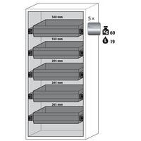 Stoccaggio sicuro, conforme alla normativa in vigore relativamente alle sostanze pericolose e infiammabili nelle aree di lavoro Funzione/costruzione: robusta e duratura: struttura esterna solida in acciaio con rivestimento epossidico, 3 cerniere di fissaggio per porta, meccanismo di chiusura completo ed elementi di sicurezza con protezione contro la corrosione montati fuori dalla zona di stoccaggio Utilizzo controllato: porte con serratura, compatibili con chiusura centralizzata (passe-partout) Installazione facile: piedi regolabili integrati Aerazione e ventilazione: sistema di aerazione e ventilazione integrate grazie al collegamento (diametro 75 mm) con un dispositivo di evacuazione dell'aria Realizzato in Germania Realizzato in Germania