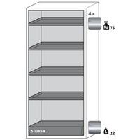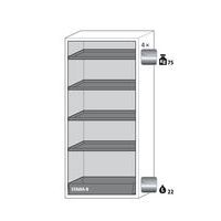 Stoccaggio sicuro, conforme alla normativa in vigore relativamente alle sostanze pericolose e infiammabili nelle aree di lavoro Funzione/costruzione: robusta e duratura: struttura esterna solida in acciaio con rivestimento epossidico, 3 cerniere di fissaggio per porta, meccanismo di chiusura completo ed elementi di sicurezza con protezione contro la corrosione montati fuori dalla zona di stoccaggio Utilizzo controllato: porte con serratura, compatibili con chiusura centralizzata (passe-partout) Installazione facile: piedi regolabili integrati Aerazione e ventilazione: sistema di aerazione e ventilazione integrate grazie al collegamento (diametro 75 mm) con un dispositivo di evacuazione dell'aria Realizzato in Germania Realizzato in Germania