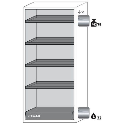 Stoccaggio sicuro, conforme alla normativa in vigore relativamente alle sostanze pericolose e infiammabili nelle aree di lavoro Funzione/costruzione: robusta e duratura: struttura esterna solida in acciaio con rivestimento epossidico, 3 cerniere di fissaggio per porta, meccanismo di chiusura completo ed elementi di sicurezza con protezione contro la corrosione montati fuori dalla zona di stoccaggio Utilizzo controllato: porte con serratura, compatibili con chiusura centralizzata (passe-partout) Installazione facile: piedi regolabili integrati Aerazione e ventilazione: sistema di aerazione e ventilazione integrate grazie al collegamento (diametro 75 mm) con un dispositivo di evacuazione dell'aria