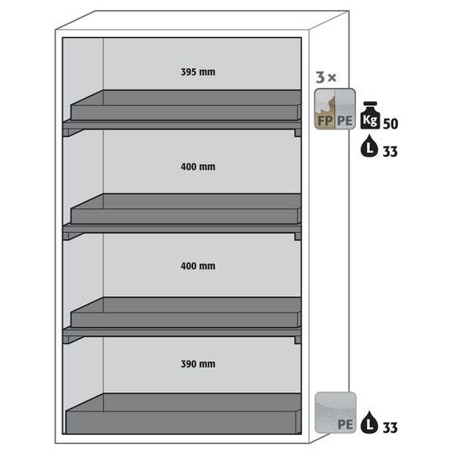 Stoccaggio sicuro, conforme alla normativa in vigore relativamente alle sostanze pericolose e infiammabili nelle aree di lavoro Funzione/costruzione: robusta e duratura: struttura esterna solida in acciaio con rivestimento epossidico, 3 cerniere di fissaggio per porta, meccanismo di chiusura completo ed elementi di sicurezza con protezione contro la corrosione montati fuori dalla zona di stoccaggio Utilizzo controllato: porte con serratura, compatibili con chiusura centralizzata (passe-partout) Installazione facile: piedi regolabili integrati Aerazione e ventilazione: sistema di aerazione e ventilazione integrate grazie al collegamento (diametro 75 mm) con un dispositivo di evacuazione dell'aria