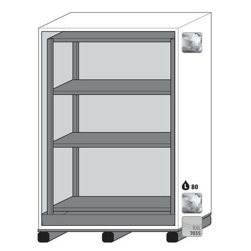 Stoccaggio sicuro, conforme alla normativa in vigore relativamente alle sostanze pericolose e infiammabili nelle aree di lavoro Funzione/Costruzione: massimo comfort di lavoro: richiamo porte automatico, blocco in posizione aperta e stoccaggio in sicurezza dei recipienti Utilizzo controllato: porte con serratura integrata Flessibilità interna: base per il trasporto in interni facile e senza rischi Aerazione e ventilazione: sistema di aerazione e ventilazione integrate grazie al collegamento (diametro 75 mm) con un dispositivo di evacuazione dell'aria Decantazione nella massima sicurezza: messa a terra end-to-end al pannello posteriore