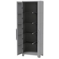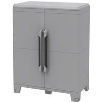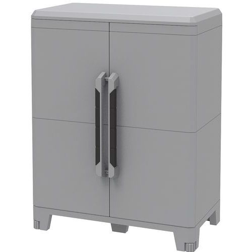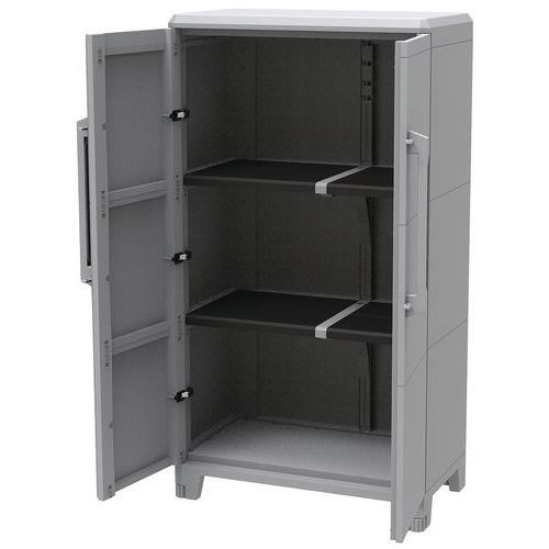 Dotato di cerniere in metallo antivento che facilitano l'apertura e la chiusura delle ante a battente. Maniglia in materiale bi-componente. Ripinai interni modulabili. Piedi anteriori regolabili in altezza e 2 piedi aggiuntivi per maggiore stabilità. Prodotto realizzato con il 80% di plastica riciclata. Possibilità di chiusura con lucchetto (non fornito). Ripiani con portata max. 40 kg, base con portata max. 80 kg. Impermeabile (certificato IP 43).