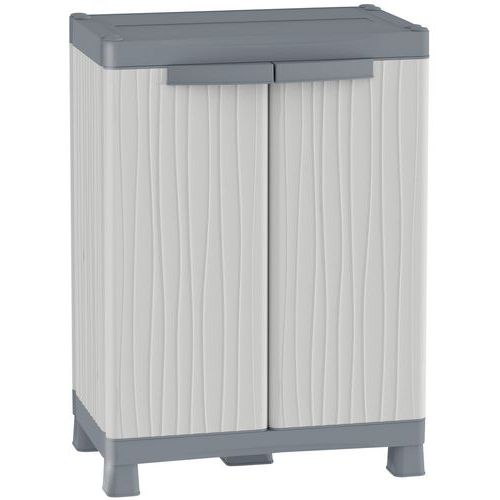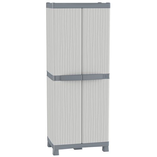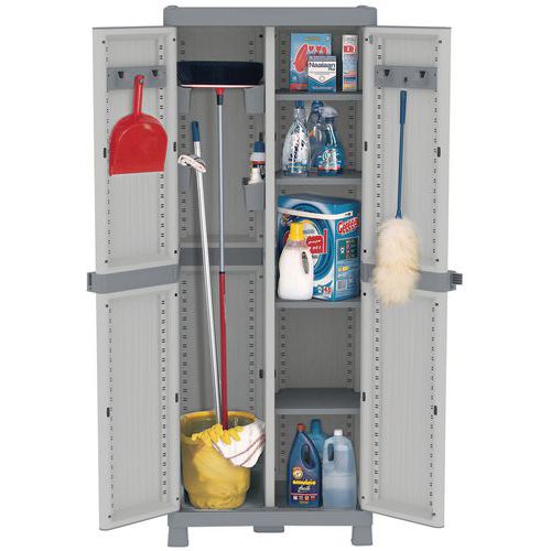 Dotato di lock system antivento, che blocca le ante semplicemente tirando e spingendo le maniglie. Sistema modulare da montare con ante con apertura a 180° e ripiani regolabili. Piede centrale per maggiore stabilità. Possibilità di chiusura con lucchetto (non fornito). Armadi a 2 ante: portata max. per ripiano 30 kg. Armadi a 1 anta e a 2 ante portascope: portata max. per ripiano 15 kg. Prodotto realizzato con l'80% di plastica riciclata.