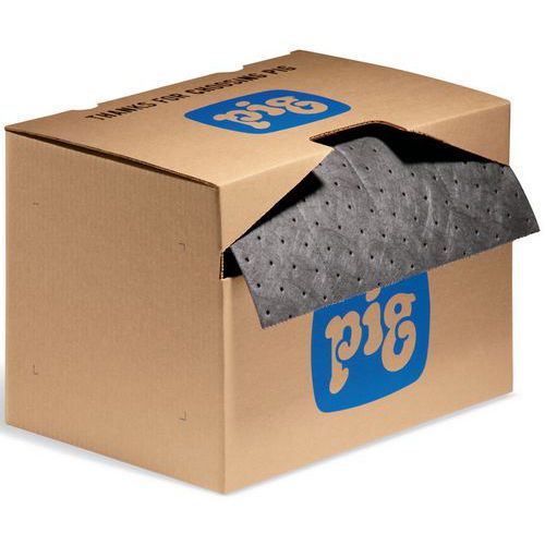 Capacità di assorbimento massima grazie al doppio spessore. Si taglia senza polvere alle dimensioni desiderate grazie alle perforazioni. Distributore in cartone pratico, leggero e semplice da trasportare grazie all'impugnatura. Colore grigio scuro per nascondere le macchie. Tappeto universale PIG Mat che dura 2 volte più a lungo dei tappeti comuni e richiede meno sostituzioni.