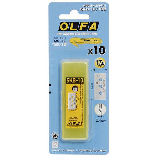 | Descrizione | Astuccio da 10 lame di ricambio SKB-10, Materiale: Acciaio, Lama, larghezza: 17.8 mm, Lama, lunghezza: 40 mm |