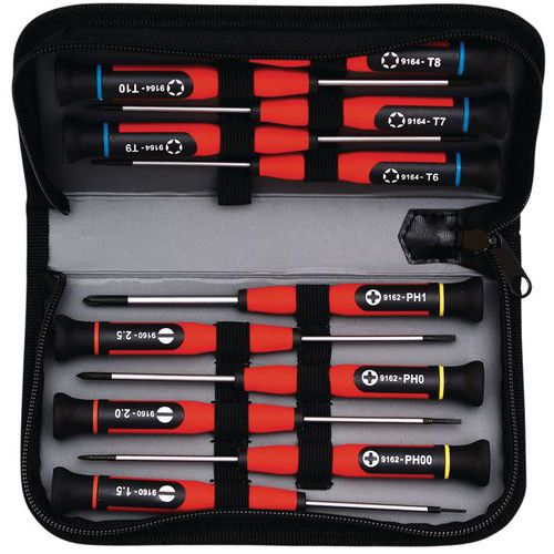 | Descrizione | Astuccio di cacciaviti di precisione, Rif. Fabbricante: 9169020001, Uso: Avvitamento, Tipo punta: Piatta |
