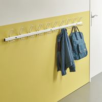Attaccapanni con 10 ganci. Acciaio rivestito con polvere epossidica. Interasse ganci: 14,50 cm.