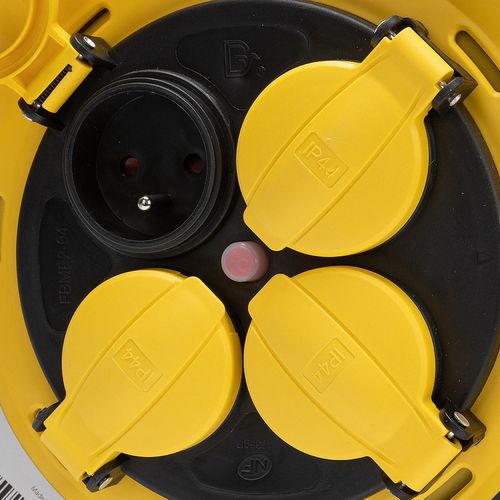 Avvolgicavo professionale IP44 (2P+T) con impugnatura ergonomica e pratica per guanti da lavoro. Telaio in acciaio ultra-resistente. Piastra fissa per avvolgere il cavo senza dover rimuovere gli apparecchi collegati alle prese. Water proof IP44, ideale per giardino, attività di bricolage, cantieri e uso da parte di professionisti. Cavo da 25 o 40 m H07RN-F in neoprene 3G2.5 m㎡.